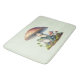 A bath mat with a cool illustration. Featuring a green frog sitting on a mound of grass. A big red mushroom sheltering him from the elements. A couple of little toadstools nearby.