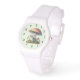 A watch with a cool illustration. Featuring a green frog sitting on a mound of grass. A big red mushroom sheltering him from the elements. A couple of little toadstools nearby.