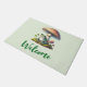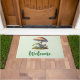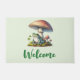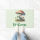 Welcome doormat with a cool illustration. Featuring a green frog sitting on a mound of grass. A big red mushroom sheltering him from the elements. A couple of little toadstools nearby.