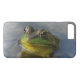 This iPhone 8/7 Plus case features a confrontational green and yellow frog with an attitude staying cool on a hot day in the blue and grey shallow water at the edge of the pond.
