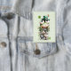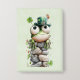 A button with a cute St. Patrick's Day image. A green frog with big cartoon eyes sitting on a stone wall. Wearing a green top hat with a shamrock and a little friend sitting on top of his hat.