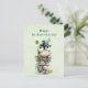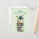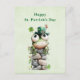 St. Patrick's Day postcard with a cute St. Patrick's Day image. A green frog with big cartoon eyes sitting on a stone wall. Wearing a green top hat with a shamrock and a little friend sitting on top of his hat.