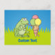 Smiling frog steals an ice-cream cone with his tongue. Custom text.