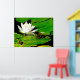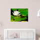 A frog sits handsomely within the reflection of the nearby Water Lily. To the left of the lily pad you can see a small tadpole swimming in the pooled water.