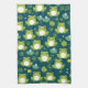 A playful pattern features cartoon frogs and various leaves and flowers on a dark green background. The frogs are evenly spaced, creating a cheerful and whimsical design.