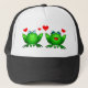 Cartoon frogs in love, expressive male and female frogs with red hearts, cheerful and cute original artwork. Hoppy blessings from Happy Wishing Well dot com.