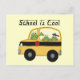 A frog bus driver drives the frog children to school in a yellow school bus and kid style text reads "School is Cool" on school T-shirts, mugs, magnets, cards, stickers, school tote bags, keychains, and more.