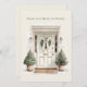 Beautiful and elegant holiday card with a lovely front door with pine trees and a holiday wreath with a simple bow.