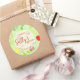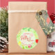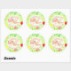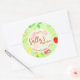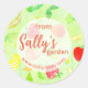 A bright sticker decorated with a variety of fruits and vegetables illustrated with watercolor on a lime green watercolor wash background with text curved around the edges that can be edited with your personal or business information.