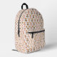 Front and back view of a backpack featuring a colorful floral pattern on a white background. The front shows a zippered pocket, the back is solid black with adjustable straps. The design is bright and playful.