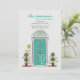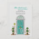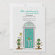 This moving announcement features a teal door flagged with topiary planters and your new house number.