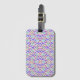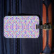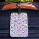 Front of luggage tag with colourful, abstract pattern of dots and circles in pink, blue, and purple. Back shows lines for personal details, strap attached.