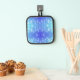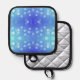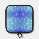 Front view features a pot holder with a blue gradient and white dots, evoking a playful, soothing feel. The back is silver with quilted stitching.