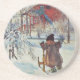 A 19th century painting of a little girl skiing towards a red farmhouse with her father in the background. Fine art by Swedish painter Carl Larsson.