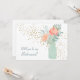 A whimsical blue green frosted image mason jar holds pastel orange and coral flowers with soft teal greenery on the front of this pretty bridesmaid invitation card. A background of gold confetti flecks add interest and contrast to the delicate flowers. Your custom text is in darker teal. The back of the invitation is white, with your custom text in teal. Make it say whatever you'd like! *This design uses artwork from LABFcreations on Etsy.