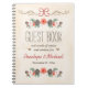 An elegant and beautiful Christmas pine cone wedding guest book with a formal and vintage retro and antique appeal. Frosted pinecones, watercolor and painted look pink, red and white Christmas roses and flowers, snowy acorn and holly berries make up a pretty winter laurel wreath. Gold flourishes and a red ribbon bow complete the festive look of this winter themed notebook. Artwork © Chrissy H. Studios, LLC. All rights reserved.