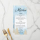 This elegant and festive dining menu features a white background in the centre with a blue frosty ice pattern in the top and bottom portions. A winter theme printed in an ivory white faux glitter design. Pine trees are featured near the bottom of the menu and several snowflakes are scattered around the background. The text is printed in an elegant and sophisticated font font which you can personalise to include your own dining options.