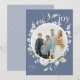 This elegant and classic holiday photo card features a beautiful circular watercolor frame of leaves, berries, and other greenery over a dark smokey blue background. The greeting on the front says "Joy" in a classic serif font. The back of the card has a simple dusty blue and white diagonal stripe background, which can be removed if desired. You can also add another photo to the back and/or additional text to the back.