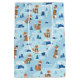 Charming red foxes in scarves wander a snowy blue forest of evergreens and mountains. Whimsical and wintery, perfect for cozy style.