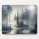 A serene winter forest scene features misty sunlight in tall frosted trees surrounding a partially frozen river
