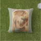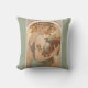A decorative pillow with the illustration by Alphonse Mucha (1860-1939), Fruit (1897). A portrait of a woman holding a basket of fruit with pears, grapes and apples.