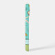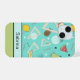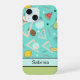 Personalise this iPhone case printed with a colourful abstract fruit and memphis style pattern on blue and green. Just edit the name text. Choose from two styles for Apple iPhone 15 or a variety of other phone models in the drop-down menu.