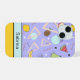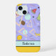 Personalise this iPhone case printed with a colourful abstract fruit and memphis style pattern on pale purple and purple. Just edit the name text. Choose from two styles for Apple iPhone 15 or a variety of other phone models in the drop-down menu.