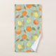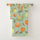 Fruit pattern with lemons, oranges, lime and grapefruit. Bright citrus fruits on a light green background with multicolored splashes of paint.