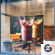 The image features two glasses of vibrantly coloured fruit drinks against a dark blue background. One glass contains a pink or red smoothie, while the other holds a yellow smoothie. The drinks in the glasses create a splash, forming a visual effect reminiscent of a crown. Several fruits, blueberries, oranges, strawberries, kiwis, raspberries and mint leaves are scattered around the theme. Some of these fruits are falling into the glasses, contributing to the splash effect. The whole setup emits a refreshing and lively atmosphere.