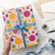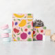 This wrapping paper pattern is a delightful celebration of vibrant fruits, perfect for adding a touch of freshness and fun to any gift. The design features an array of colourful fruit illustrations, including yellow bananas, red apples, green pears, purple grapes, and pinkish-red pomegranates, all set against a light yellow background. Scattered among the fruits are smaller elements like green leaves, blueberries, and flowers in shades of purple and blue, adding to the playful and lively feel of the pattern. Ideal for festive occasions, birthdays, or any celebration that calls for a cheerful and eye-catching presentation.