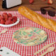 Fruits, peaches, pears, lemons, watercolor paper plate