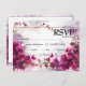 The postcard-style RSVP wedding card, an integral part of the "Fuchsia Enchantment: Watercolor Wedding Suite," features a picturesque front adorned with the captivating backdrop of fuchsia blooms and ivy creeper. At the top, a commanding caption reads, "Please Reply," followed by the date to respond by. Below, thoughtful options are presented for guests to indicate their response: "Accepts with pleasure," "Declines with regret." Additionally, three meat options, including a vegetarian choice, are available. Ample space is provided for guests to insert their names and state their meal preference, ensuring the couple can accommodate dietary preferences and restrictions.