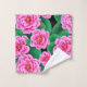 Towel set in a pattern of camellia flowers in shades of deep to pastel fuchsia pink, against a background of dark jade green leaves