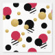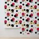 This fun wallpaper features polka dots in fuchsia pink, gold, black and stripes. The perfect accent addition to your home decor.