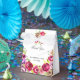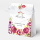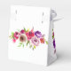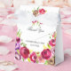 Beautiful bright pink fuchsia watercolor flowers decorate this romantic, modern wedding party favour box. The elegant typography is framed by a gorgeous vibrant magenta and purple floral bouquet of roses on both sides. A classy choice for a summer afternoon wedding reception in a garden.