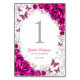Fuchsia pink silver Quinceanera celebration table number cards. Features, script font, silver butterflies, watercolor roses and tiara. Perfect for an elegant princess style glam celebration. Personalize with your own details. Printed Zazzle invitations or instant download digital printable template.