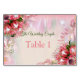 Gold ribbon & Fuchsia Protea flower bouquets on creams - number and name cards for each table