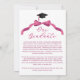 Pretty graduation announcement personalised with an arch-shaped photo adorned with a pretty ribbon with a bow in a fuchsia rose shade of pink and, on the back, custom text about your graduating daughter. Double-sided graduation announcement with a white background and pretty pink bows. Girly graduation announcement template personalised with photo and the graduate's name in a beautiful pink script.