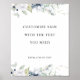 In need of certain wording in a sign not available in our collection? , no worries, with this sign you have the ability to add any message you like according to your needs. You can even select "customise further" and select different text font style, position, colour and size. Click on text and choose from menu to the right. Click on "done" top corner bottom once finished. 8" x 10" size is simply and example, sign available in a variety of sizes. Design with beautiful watercolor greenery and floral framing your text in a beautiful blend of white, blue and green hues. Part of our "Elegant Bliss" collection with a variety of wedding and event coordinating products available, including whole set of event signage.