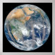 Full Earth showing the eastern hemisphere. The four vertical lines of haze visible in this image shows the reflection of sunlight off the ocean, known as glint.
