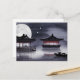 AI creation of a traditional Chinese ink wash paining featuring a full moon behind pavilions and a boat.