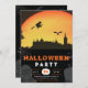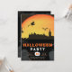 The top half of the invitation sets a spellbinding scene, featuring a radiant full moon illuminating the night sky. Against this lunar backdrop, a witch takes flight on her broomstick, silhouetted by the moon's ethereal glow. It's a bewitching sight that perfectly captures the magic of Halloween.