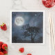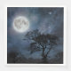 Trees silhouette against a beautiful night sky with full moon. The background in this image is AI, but the moon, middle ground trees, some stars, and the foreground tree have been added creating a more interesting fictional landscape image with greater depth.