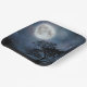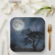 Trees silhouette against a beautiful night sky with full moon. The background in this image is AI, but the moon, middle ground trees, some stars, and the foreground tree have been added creating a more interesting fictional landscape image with greater depth.