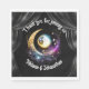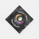 A wonderful and vibrant 3D looking full moon is floating above glowing blue fluffy clouds that have small stars twinkling in them. The moon is framed by a faux gold, magenta and blue crescent moon that has small twinkling stars in it and a shimmer black theatre curtain drape. Editable white templates appear below the graphic. Ideal for a moon and stars wedding; for your special starry night themed anniversary or for any wiccan business; lodge or resort.