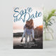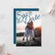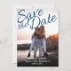 Full photo save the date with script text design on front and three photos on back of card. Colour of back and text can be changed when personalising to compliment your own engagement photos.