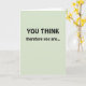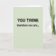 Celebrate a major professional achievement of your colleague, friend, or loved one with this card! The message is a play on the philosopher René Descartes' phrase "Je pense, donc je suis [I think, therefore I am]" ("cogito ergo sum"). The front of the card reads: "YOU THINK," followed by "therefore you are..." Opening the card, the wording continues: "A FULL PROFESSOR! Congratulations!" The front of the card is pale green, and the message appears in black print lettering. Perfect for advancement to full professor in any academic field or discipline.
