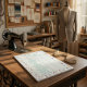 Design: Clean teal-colored table set against a whimsical sewing-themed illustrative pattern.