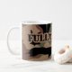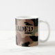 White mug with 'Fully Loaded' slogan in army/ military style font against camouflage background (tans, greens, browns and black)