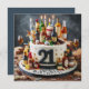 FUN "BOTTLES" THEMED 21ST BIRTHDAY LAYER CAKE ON THE FRONT OF THE CARD. COMPLETELY EDITABLE COPY ON THE BACK.